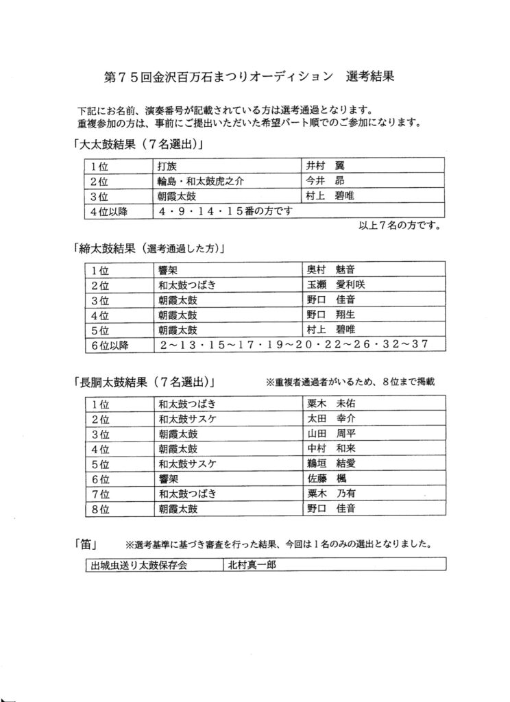 2026年3月29日 / 最終更新日 : 2026年4月7日 中橋 ご案内 第75回金沢百万石オーディション 選考結果のお知らせ 3月29日開催の石川県太鼓連盟 合同曲の [飛翔の刻]演奏パート別の オーディションの結果です FacebookXBlueskyHatenaCopy